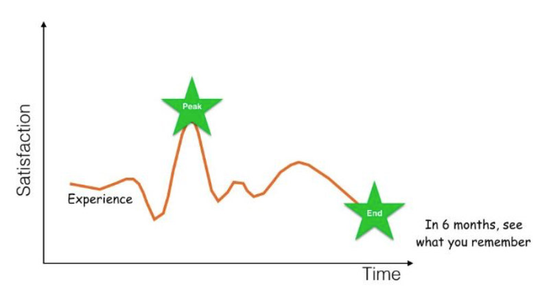 诺贝尔奖获得者,心理学家DanielKahneman,发现人类记忆由两个因素决定:高峰(高潮/低谷)时和终止时的体验,即峰终定律(Peak-EndRule)。这个法则是基于潜意识来总结经验的特征:对某件事的经历后,所能记住的只是经历的高峰和终点,至于其他经历过程中的好与坏的比重几乎不会写入记忆,这就是所谓的“关键时刻MOT”,MOT是服务世界中最具震撼力和影响力的管理概念和行为模式。